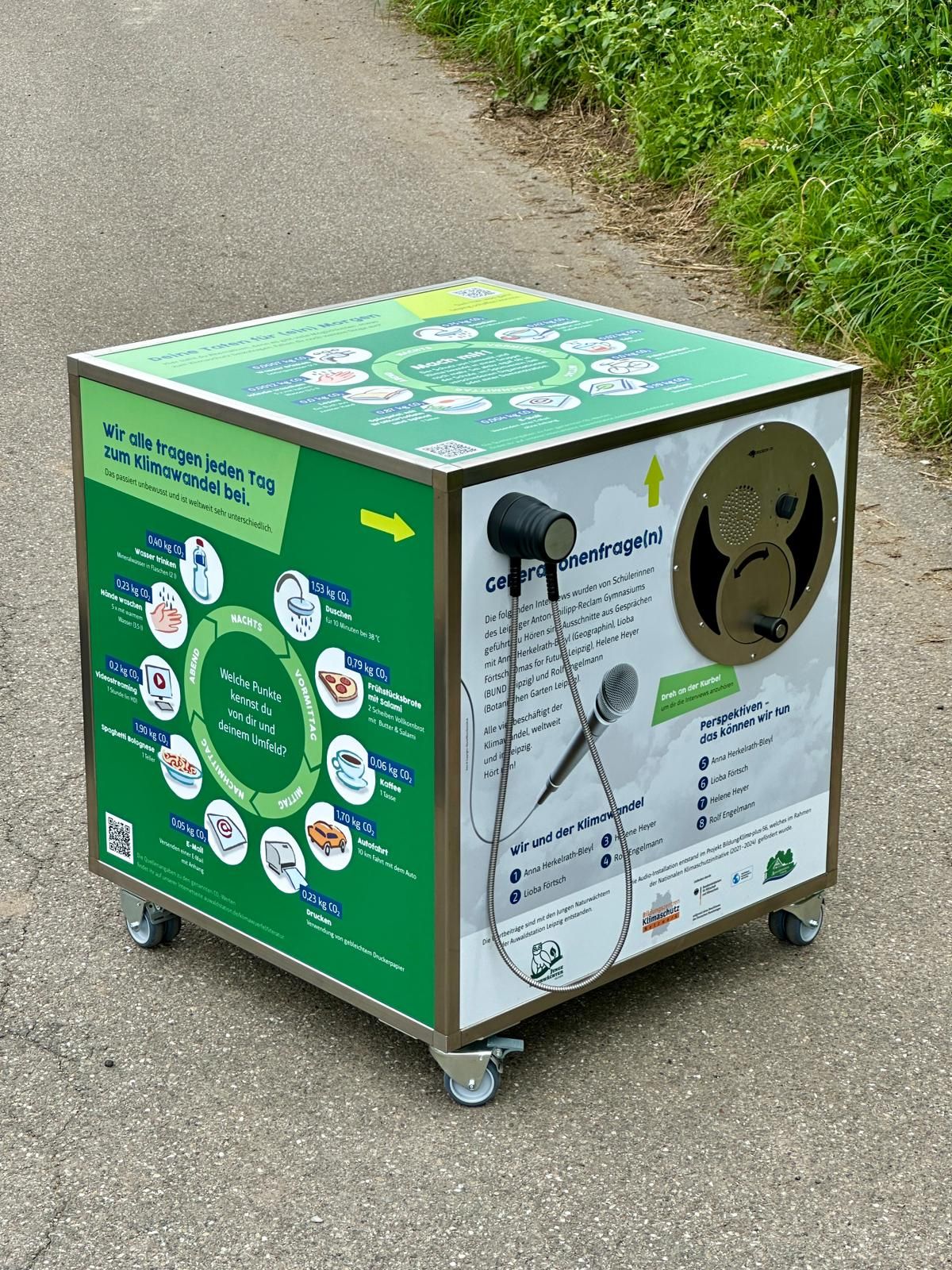 HÖRWÜRFEL: Mobiler Audiokubus (80x80x80 cm) mit 2 Kurbelhörstationen, Edelstahlrahmen und Lenkrollen. Autarker Betrieb, 2 EH240-Hörer, wetterfest. Ideal für Outdoor-Einsatz.